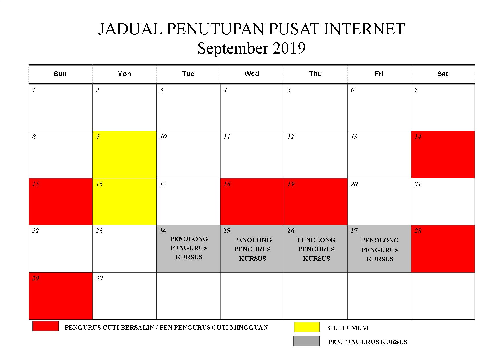 MAKLUMAN PENUTUPAN PUSAT INTERNET BAGI BULAN SEPTEMBER 2019 KERANA PENGURUS CUTI BERSALIN SILA RUJUK JADUAL UNTUK KETERANGAN LANJUT. UNTUK DIHUBUNGI :PENGURUS : 011-37034842PEN.PENGURUS : 012-9344875 TERIMA KASIH.