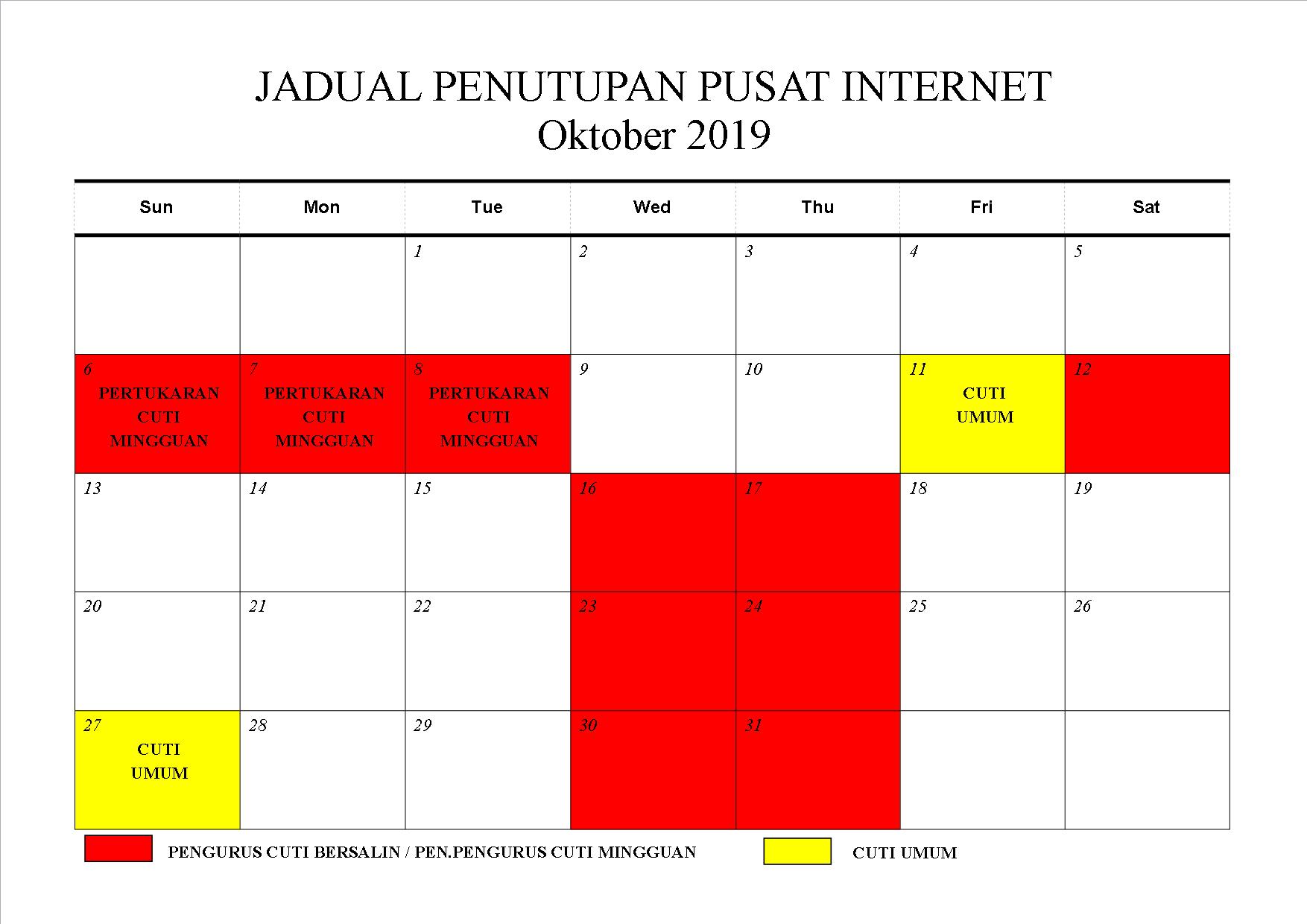 MAKLUMAN PENUTUPAN PUSAT INTERNET BAGI BULAN OKTOBER 2019 KERANA PENGURUS CUTI BERSALIN SILA RUJUK JADUAL UNTUK KETERANGAN LANJUT. UNTUK DIHUBUNGI :PENGURUS : 011-37034842PEN.PENGURUS : 012-9344875 TERIMA KASIH.